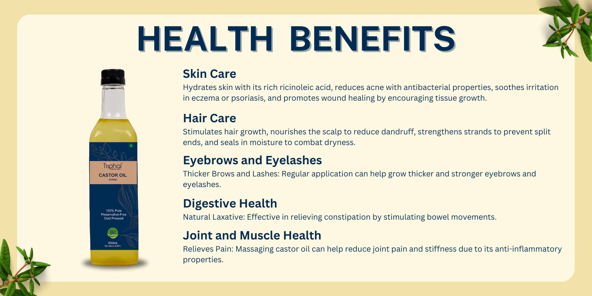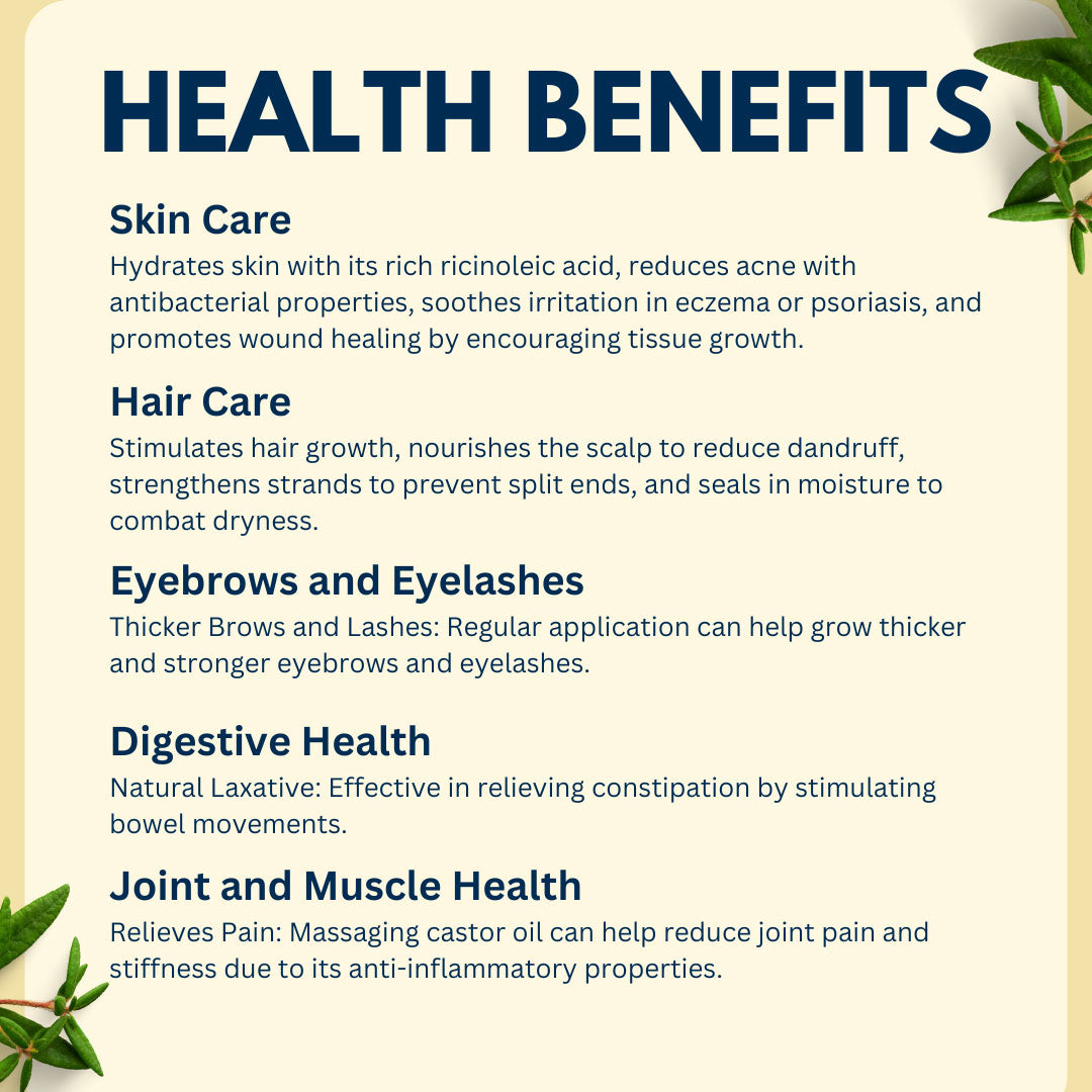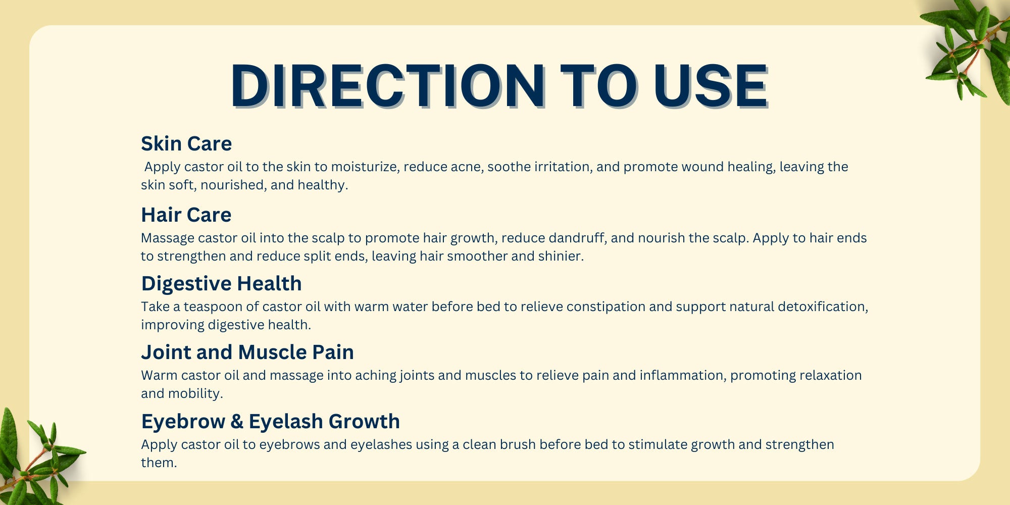 Castor oil is renowned for promoting hair growth and nourishing strands. Its rich nutrients and fatty acids make it a natural conditioner, adding shine and strength to your locks.