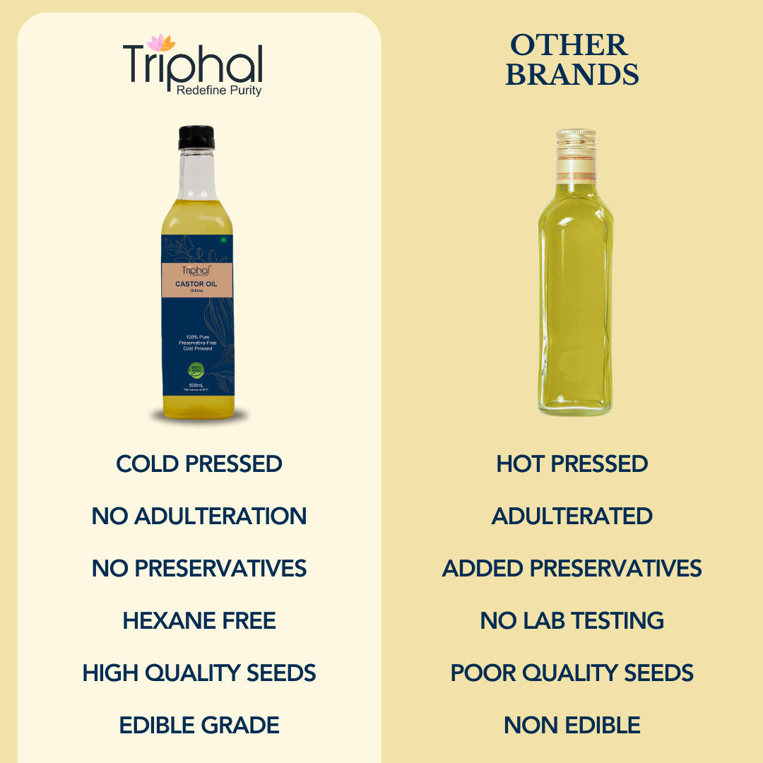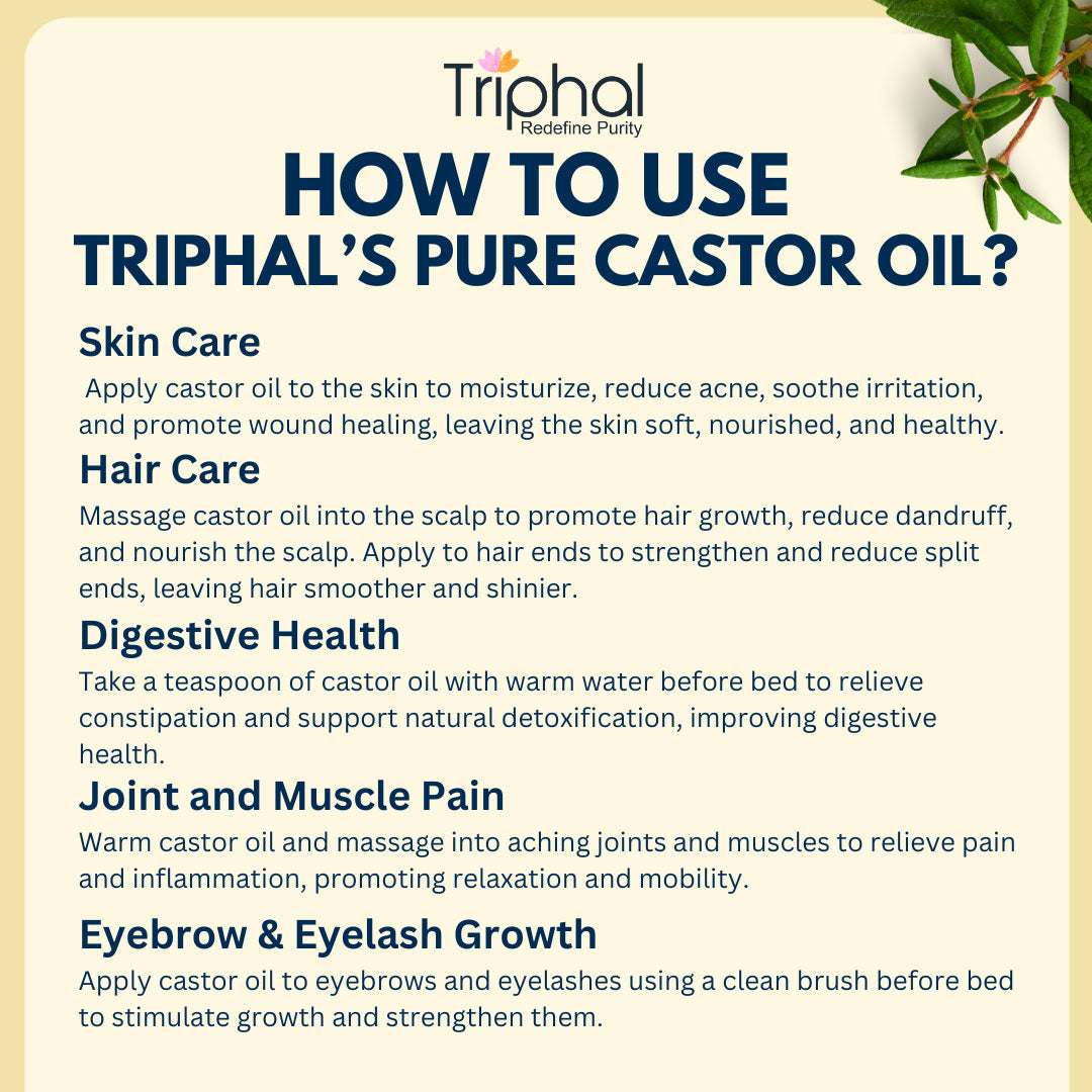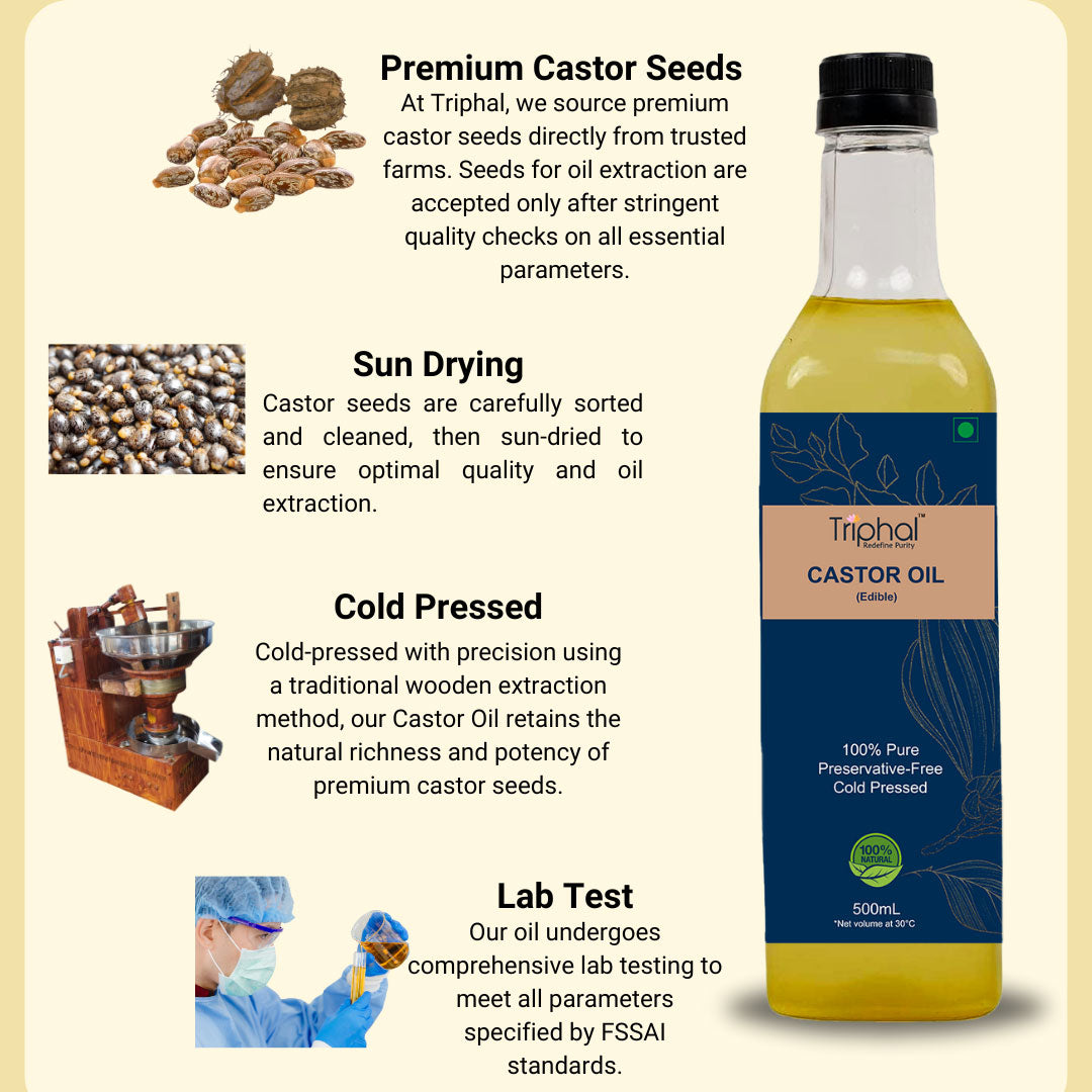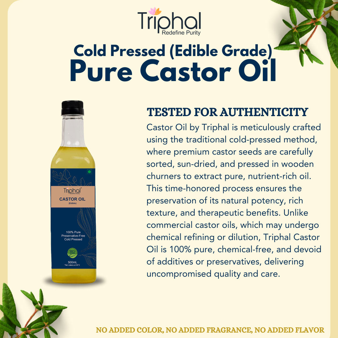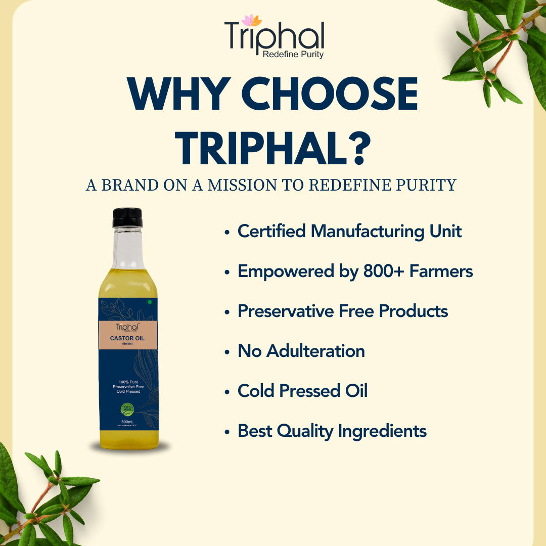 Cold-pressed with precision using a wooden extraction method, our castor oil preserves the inherent goodness of castor seeds. Bursting with antioxidants, Triphal's castor oil promotes overall well-being.
