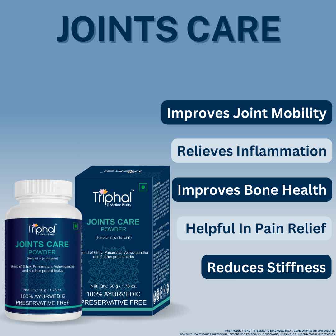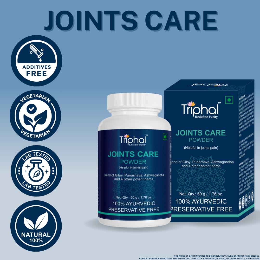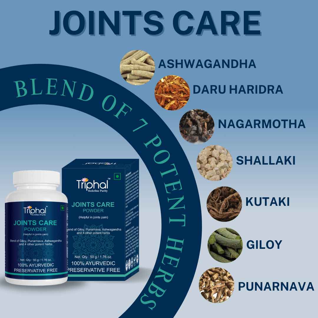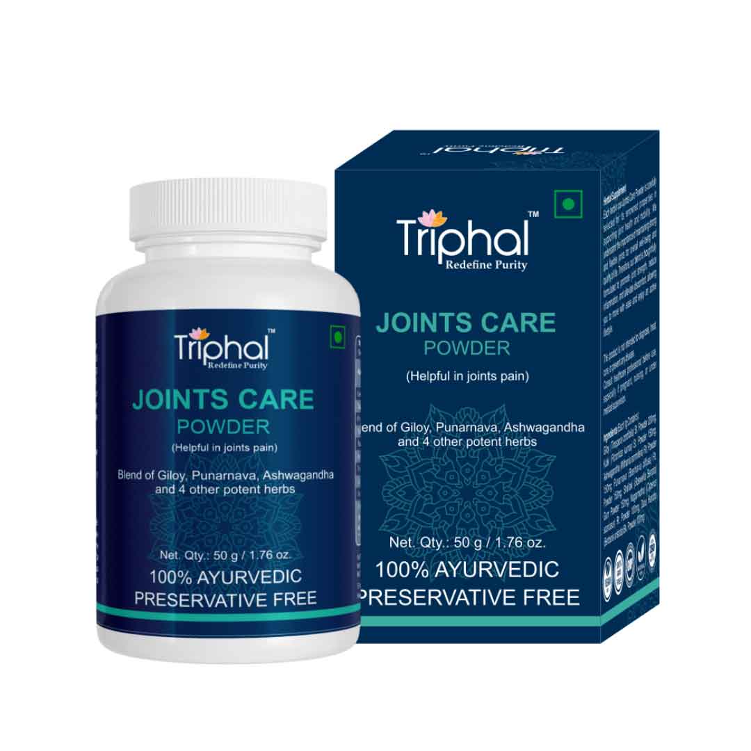 Introducing Joints Care Powder by Triphal, a carefully crafted herbal blend designed to support joint wellness naturally. This unique formula combines the benefits of Giloy, Kutki, Ashwagandha, Punarnava, Shallaki, Nagarmotha, and Daru Haridra, all revered in traditional herbal practices for their joint-supportive properties.