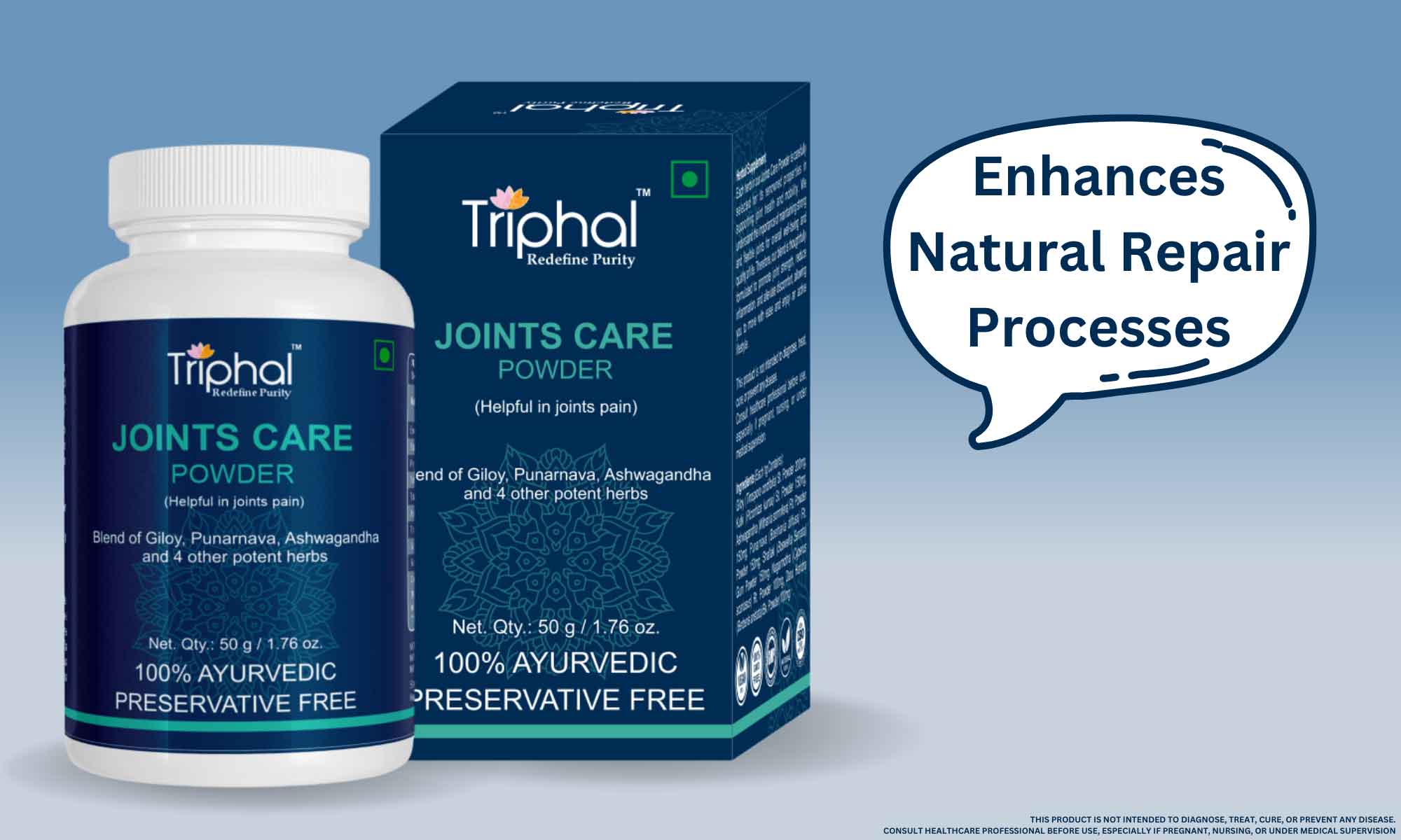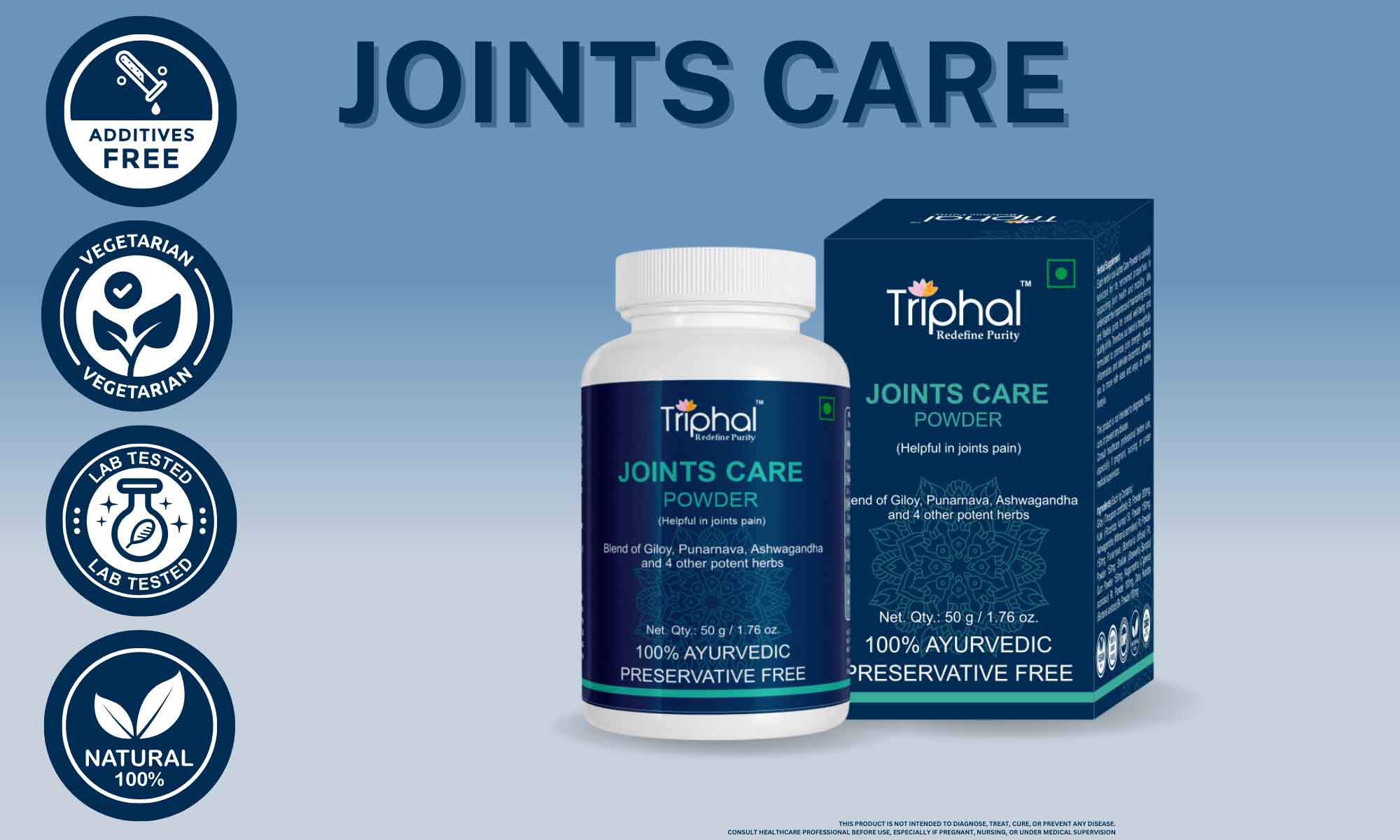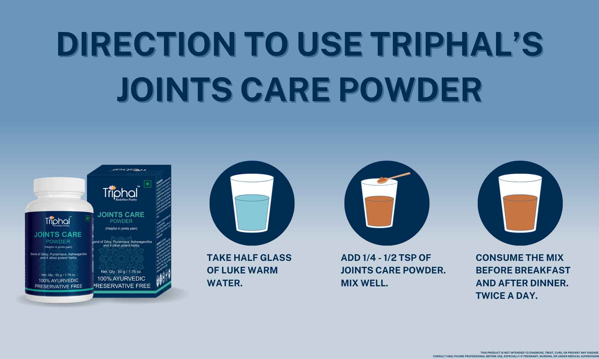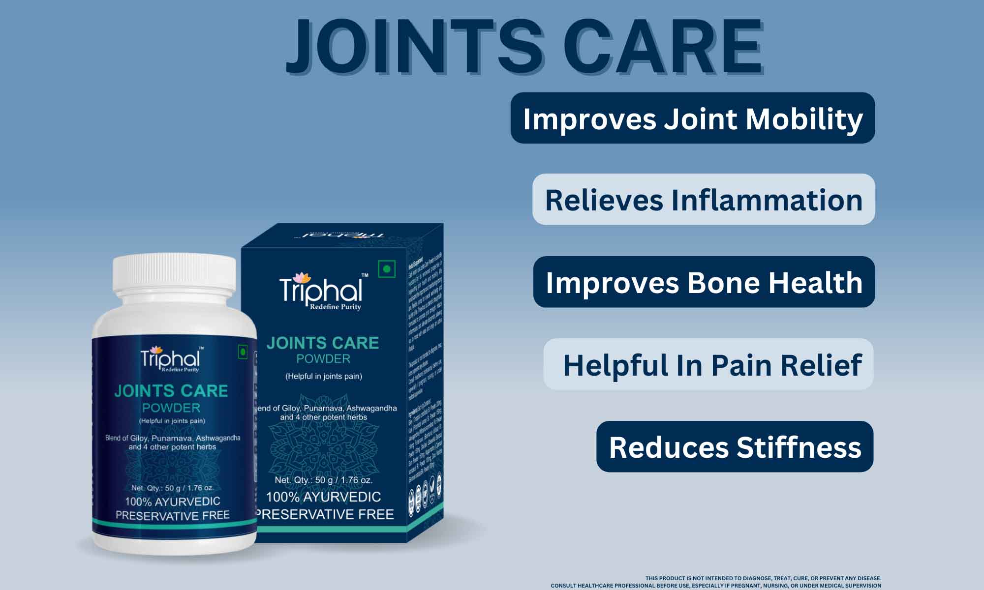 Introducing Joints Care Powder by Triphal, a carefully crafted herbal blend designed to support joint wellness naturally. This unique formula combines the benefits of Giloy, Kutki, Ashwagandha, Punarnava, Shallaki, Nagarmotha, and Daru Haridra, all revered in traditional herbal practices for their joint-supportive properties.