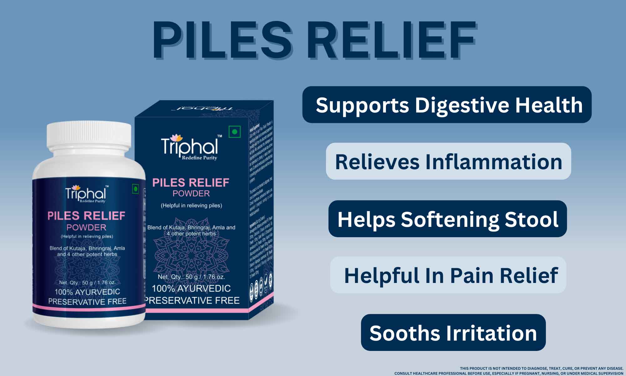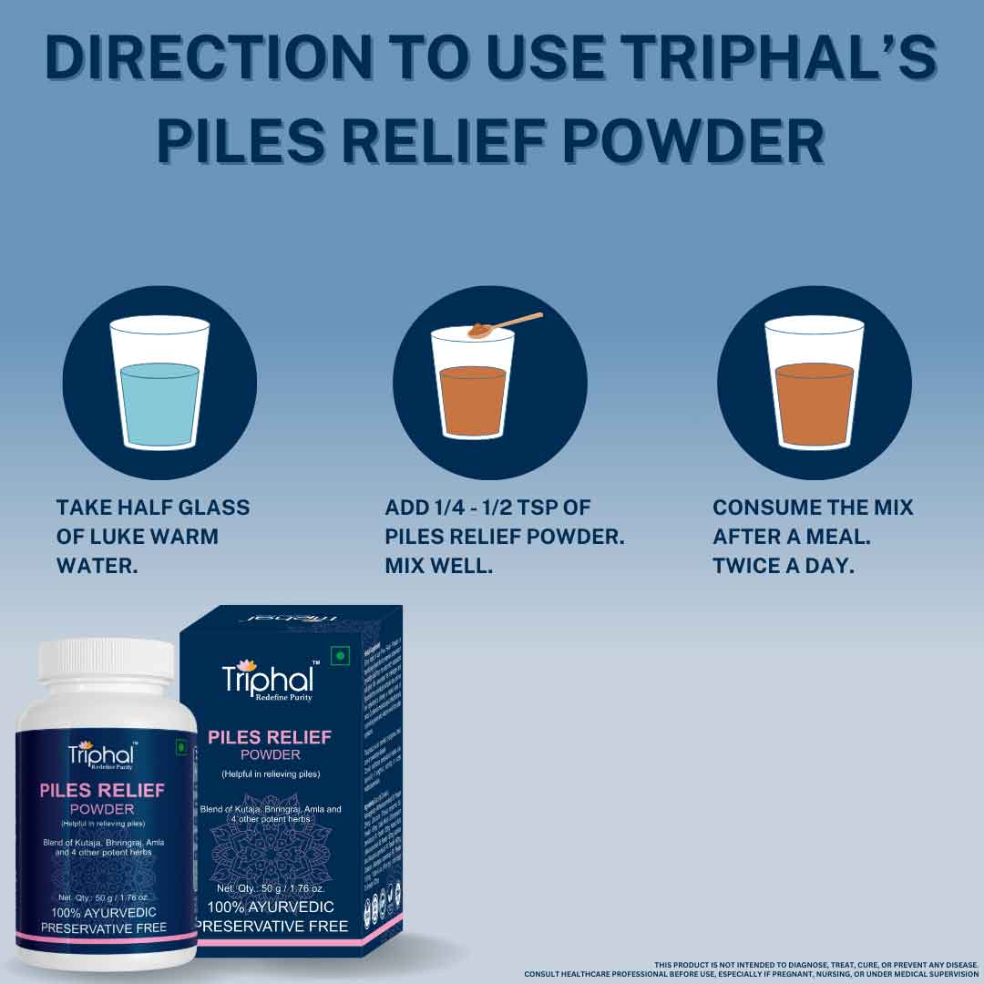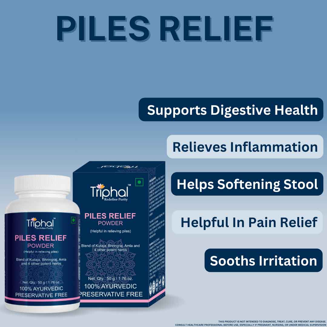Experience the natural support of Piles Relief Powder by Triphal, a carefully crafted herbal blend aimed at enhancing your digestive wellness and providing relief from piles. This unique formula combines the traditional wisdom of herbal practices with the power of Haritaki, Bibhitaki, Amalaki, Kutaja, Bhringraj, Chitrak Mool, and Pipal. Each ingredient has been carefully chosen for its ability to contribute to a comfortable and balanced digestive experience, helping to maintain regularity and overall digestive harmony.