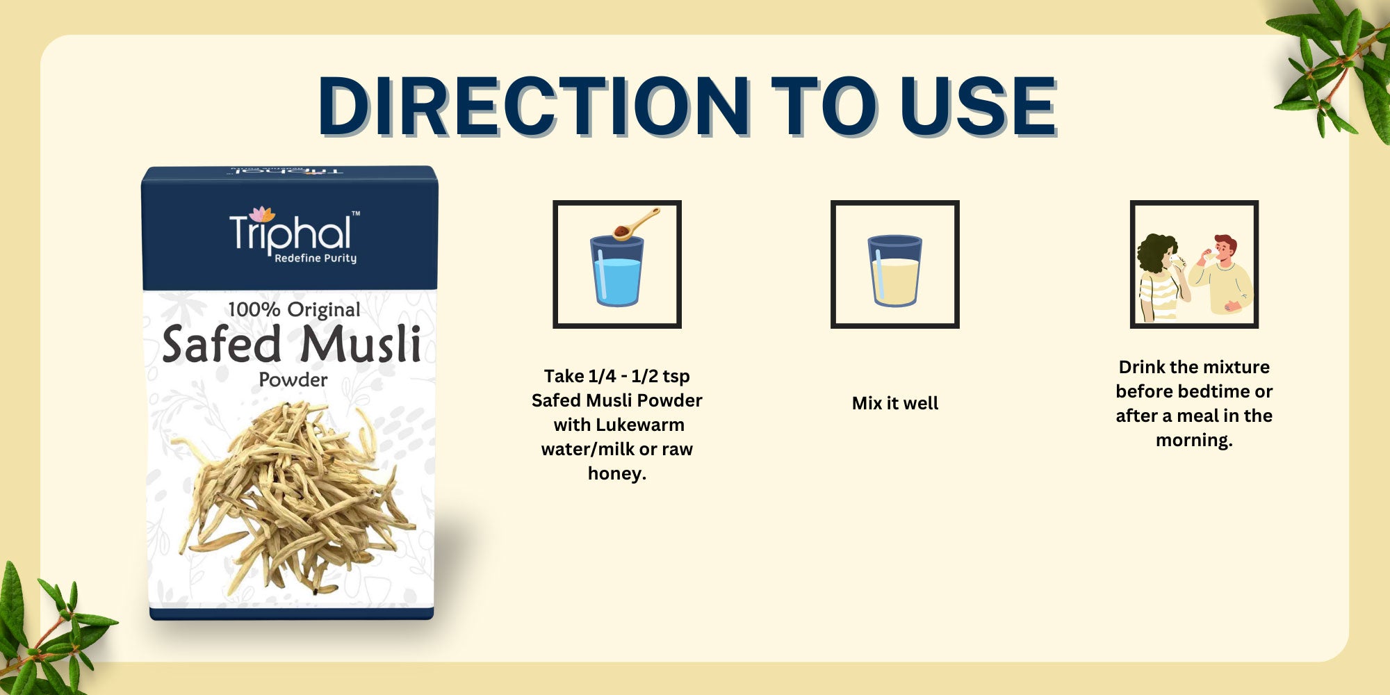 Mix 1/4 to 1/2 teaspoon with lukewarm water, milk, or raw honey. Consume before bedtime or after a morning meal for optimal results.