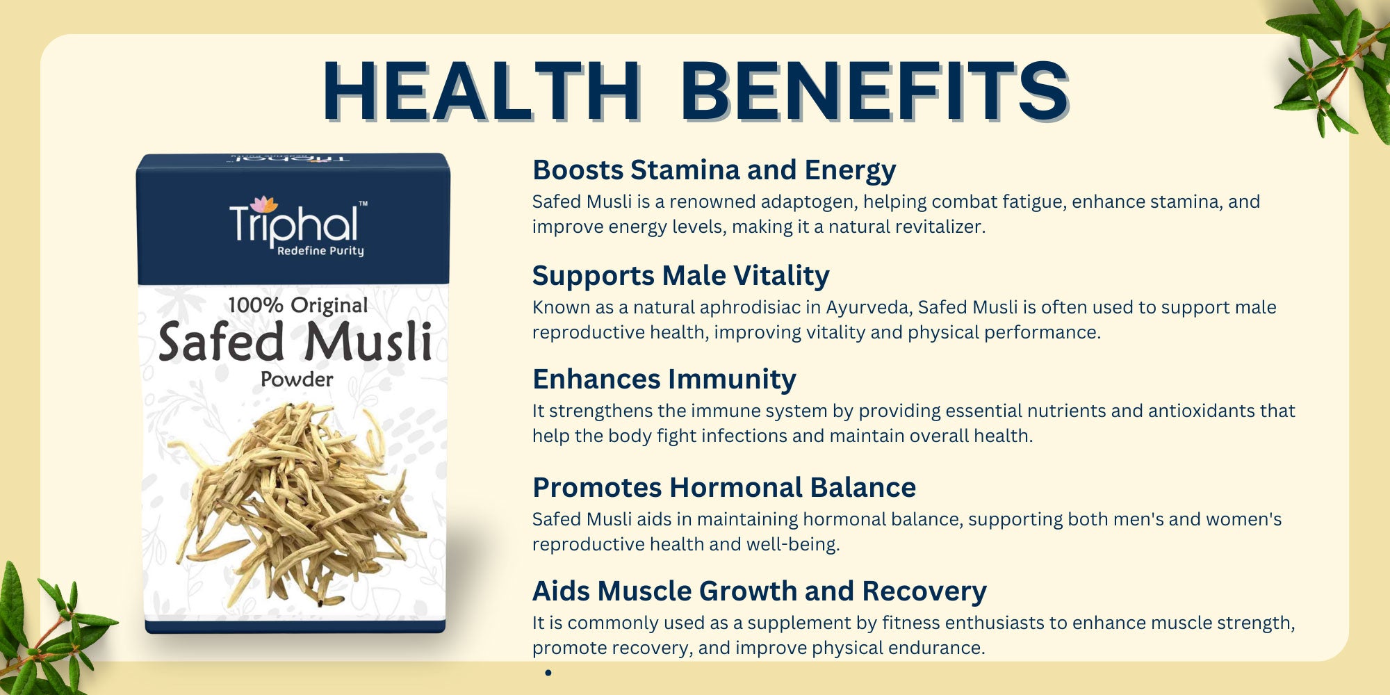 Safed Musli Powder is a premium natural herb known for its versatility and numerous benefits. This pure, 100% organic powder can be easily incorporated into daily routines, whether mixed with warm water, milk, or honey. With its rich nutrient profile, Safed Musli Powder helps boost overall well-being and supports an active lifestyle. It is an excellent addition to any wellness regimen, providing a natural way to maintain energy and balance throughout the day. Ideal for those seeking a natural, high-quality product to enhance their daily health routine, Safed Musli Powder is a must-have in any holistic lifestyle.