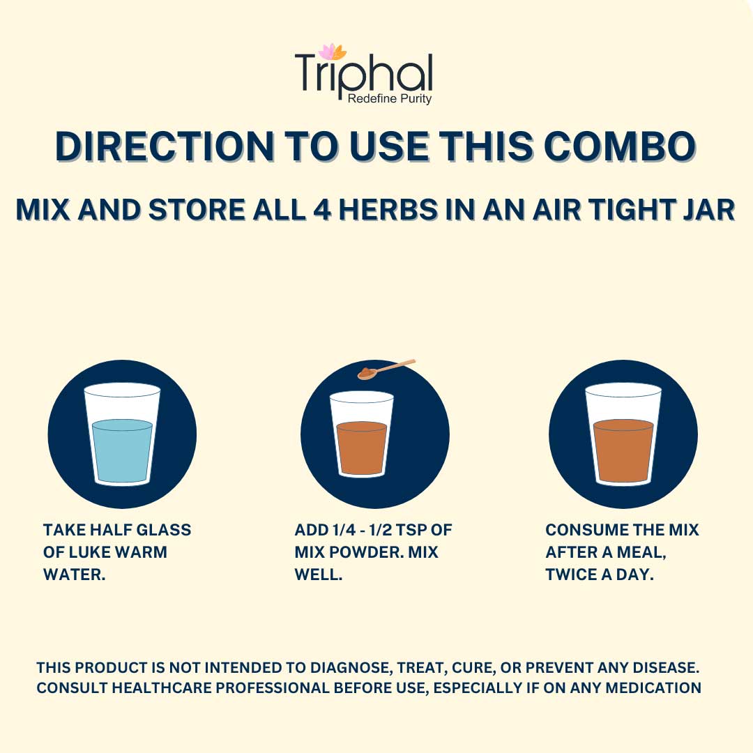Mixed powder of all 4 herbs (equal quantities) can be taken by mixing it with water, milk, smoothies, or herbal teas. The typical dosage ranges from 1/4 to 1/2 teaspoon per day.