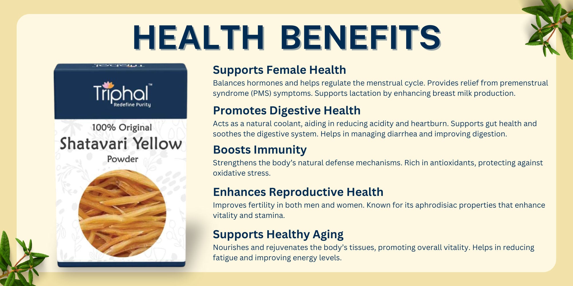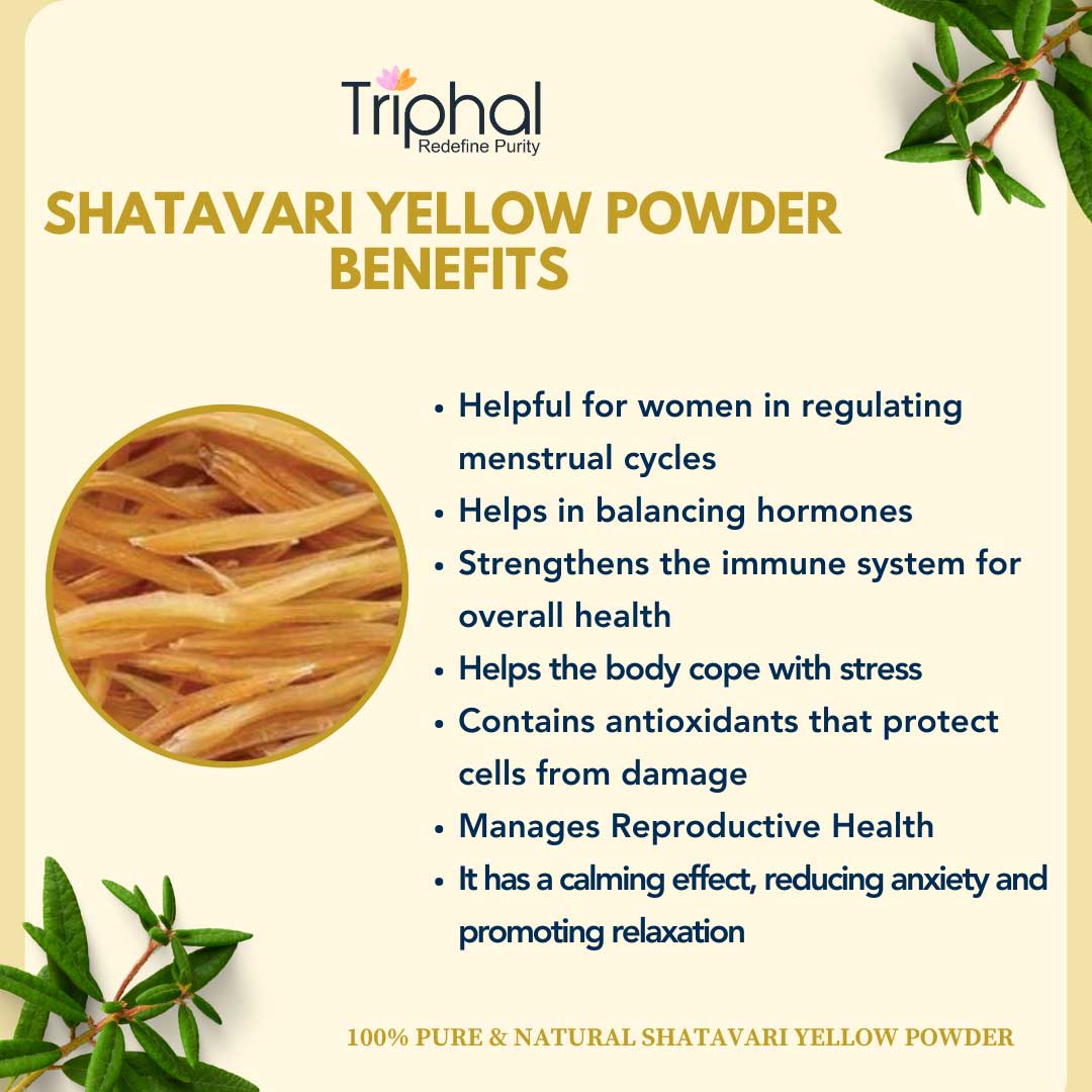 Shatavari Powder is known to help balance hormonal levels, support menstrual health, enhance fertility, and promote overall reproductive wellness in women. It is also rich in antioxidants, which can boost immunity and aid digestion.