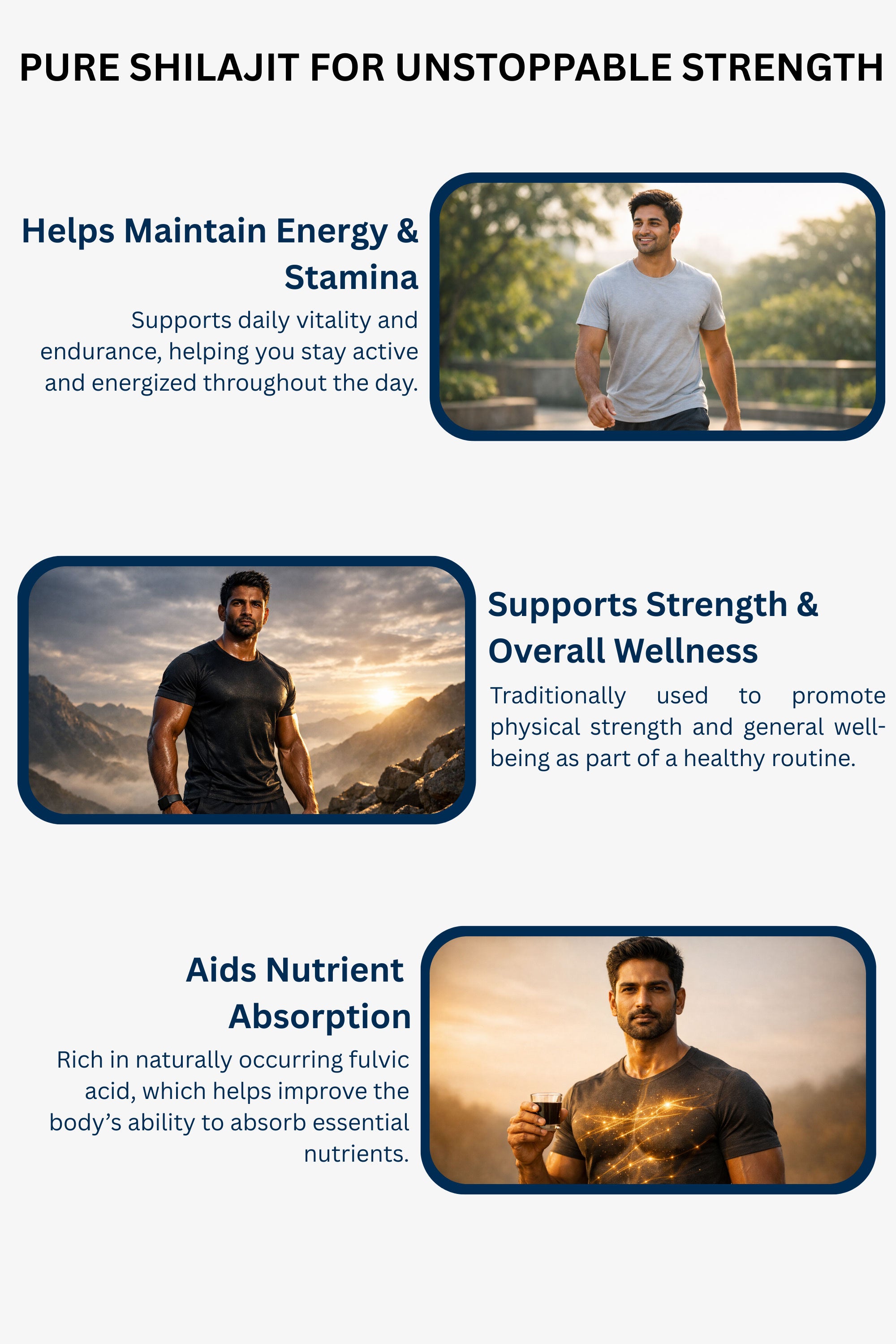 Crafted for adults 18+ seeking to support daily vitality, natural energy balance, and overall wellness with traditionally purified Ayurvedic Shilajit as part of a healthy lifestyle.