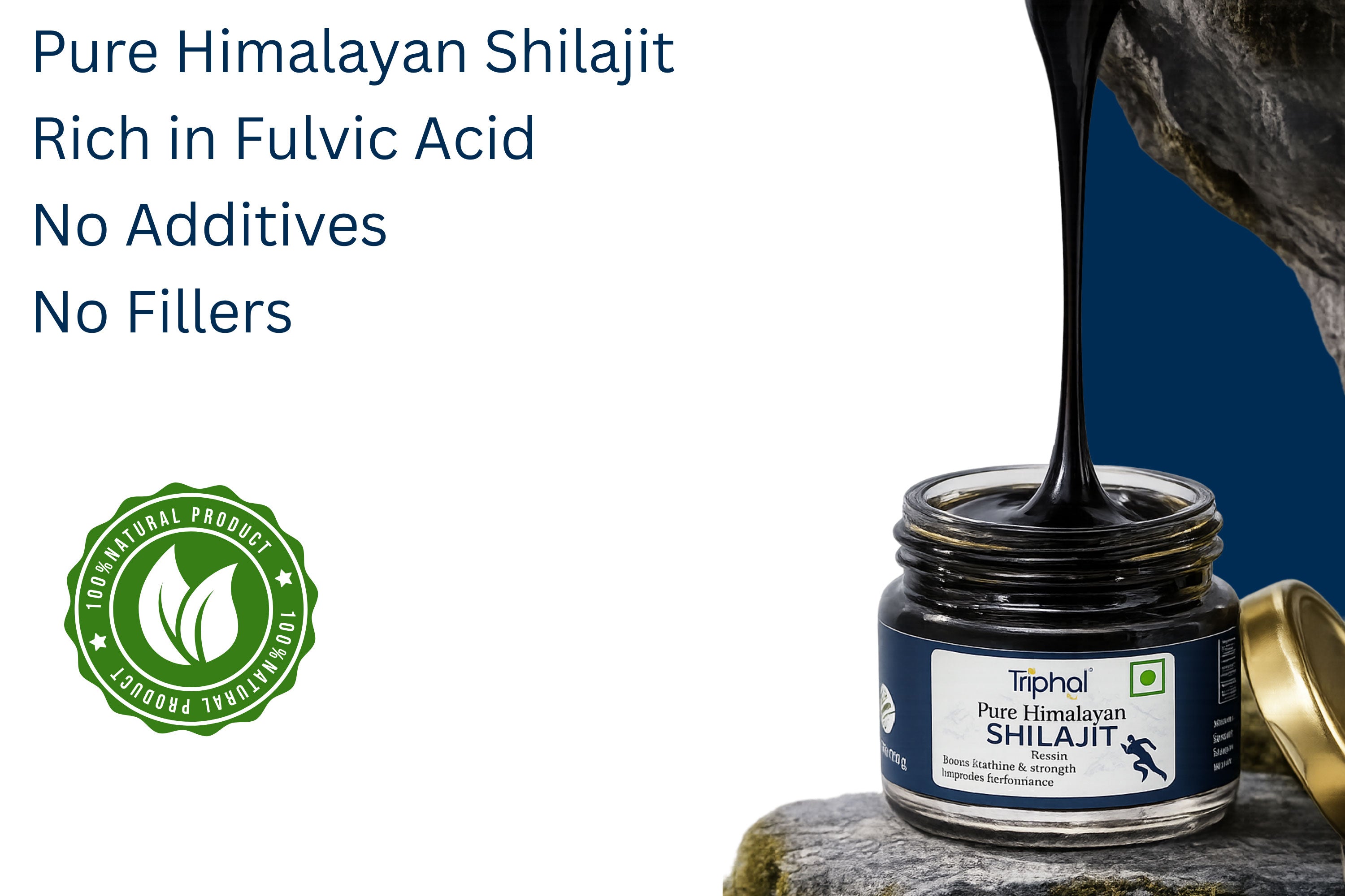 Triphal Shilajit Resin is a premium purified Himalayan Shilajit, processed using traditional Ayurvedic methods. Naturally rich in fulvic acid, trace minerals, and plant-based bioactive compounds, it supports daily energy, stamina, and overall vitality. A natural wellness supplement designed to complement an active lifestyle and balanced nutrition.